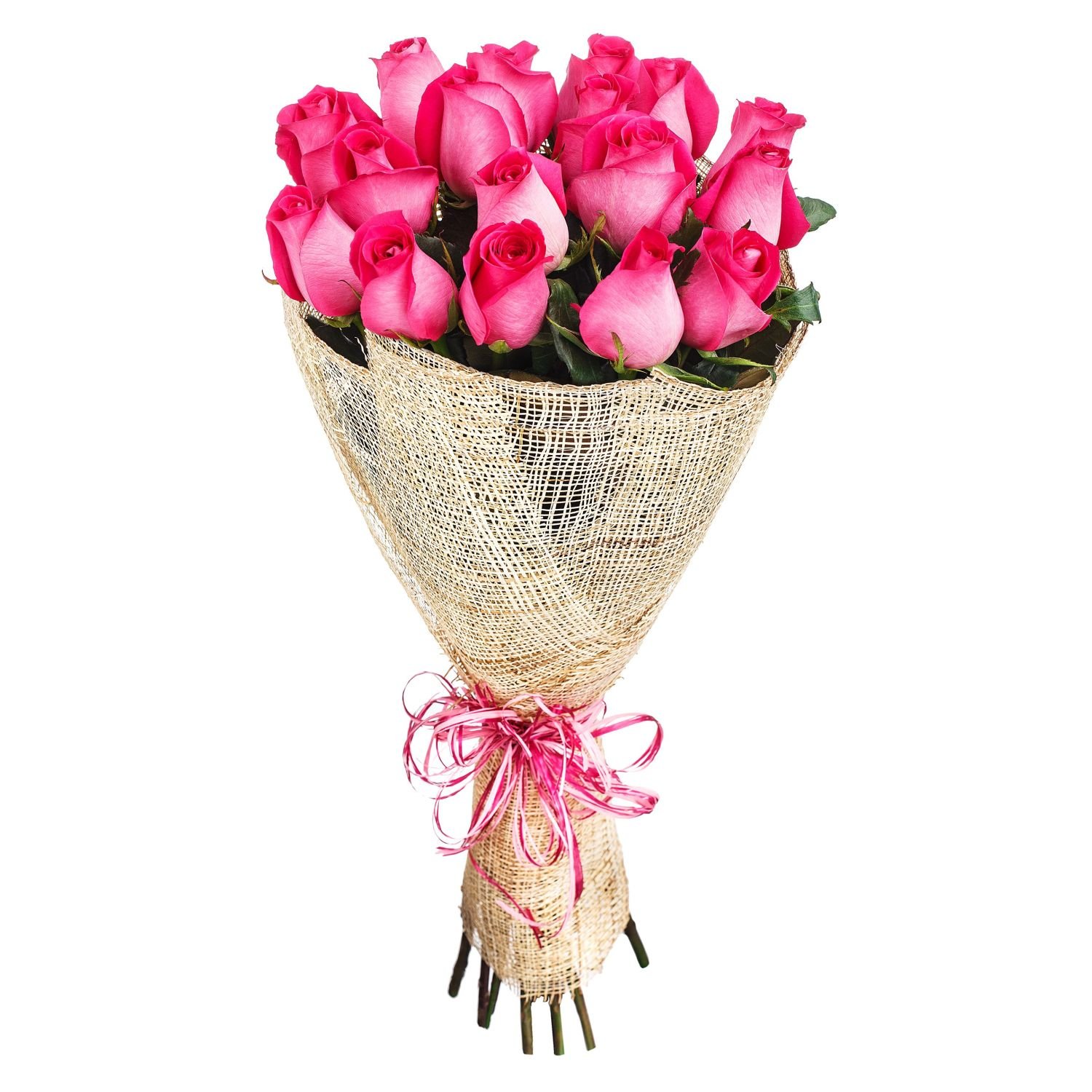 This elegant bouquet of vibrant pink roses brings a sense of joy, warmth, and charm to any occasion. The striking pink blooms, expertly arranged and carefully wrapped in natural burlap, create a fresh and graceful look that is sure to delight. Perfect for birthdays, anniversaries, or simply expressing appreciation, these roses blend beautifully together, evoking feelings of tenderness and celebration. We deliver on the same day when you order during business days, and you can select an exact delivery time for your convenience. You can count on reliable delivery, always confirmed by email. Each bouquet is arranged by our experienced florists with your satisfaction in mind.