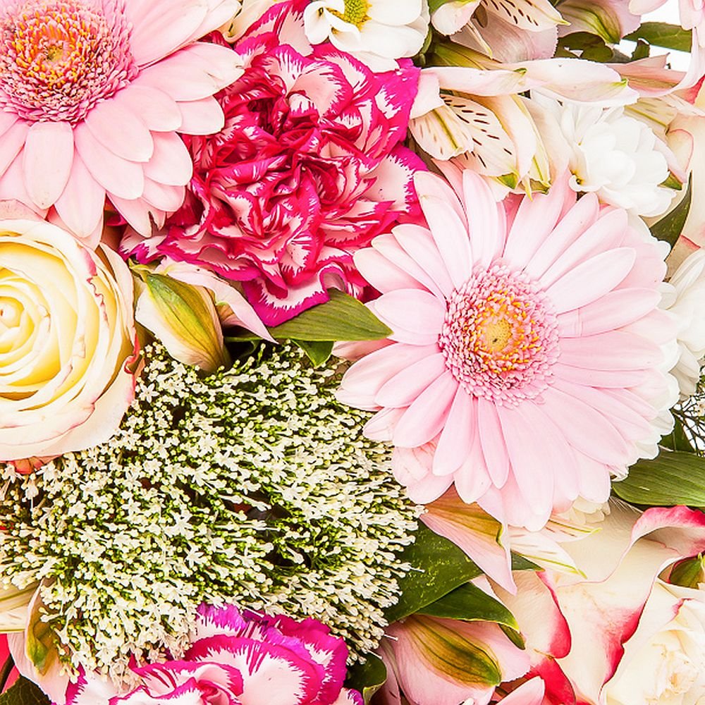 | Standardní | 3 ks karafiát, 3 ks růže, 3 ks gerbera mini, 2 ks santini, 1 ks gypsophila, 2 ks alstromeria, manžeta, mašle a dekorativní zeleň (italský ruscus, salal) |